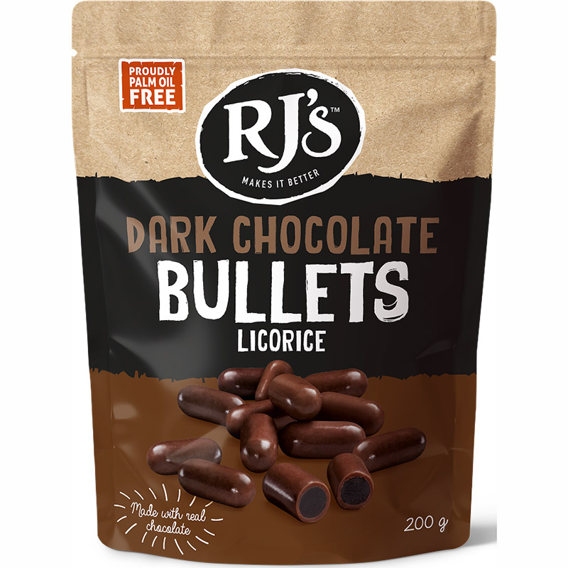 RJ’s Dark Bullets 200g feature rich, dark chocolate wrapped around soft black licorice for a bold, indulgent bite. Crafted in New Zealand and gluten-free—perfect for chocolate lovers who crave a twist.